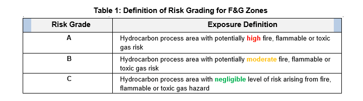 Within scope of performance-based F&G mapping study the Risk Grading assessment is an exercise which is required to define the degree of hazard or risk associated with process equipment within an FGS monitored area (Zone). The Risk Grade will directly correlate to FGS performance targets (coverage and safety availability) that reduce risk to tolerable levels. Based on the Fire and Gas Philosophy, the risk grades to be used in the performance-based F&G mapping studies are presented in the Table below: