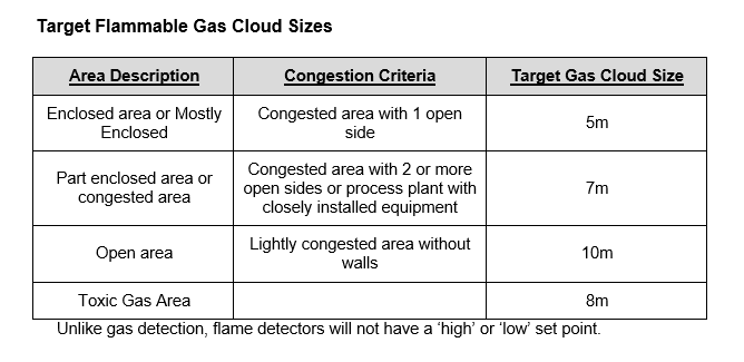 Performance targets based on the above criteria will be applied for flammable gas detection in the appropriate areas depending on the congestion