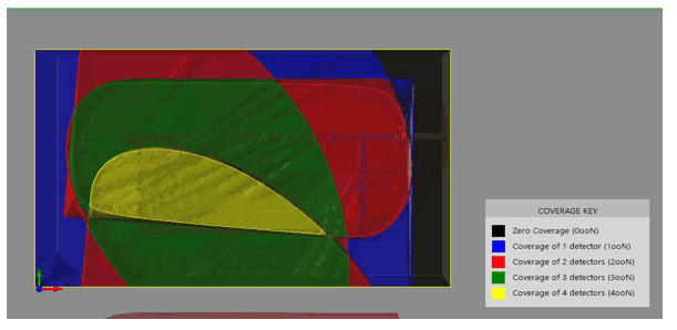 The output of detection coverage assessment performed by Detect 3D is colour coded map (coloured detection coverage overlays at elevation of interest) of assessed Zone in addition to table where the coverage is calculated in terms of percentages. Percentages are provided for the monitored areas that have no coverage, one detector coverage, or two or more detector coverage. These results then used to compare achieved coverage versus target coverage.